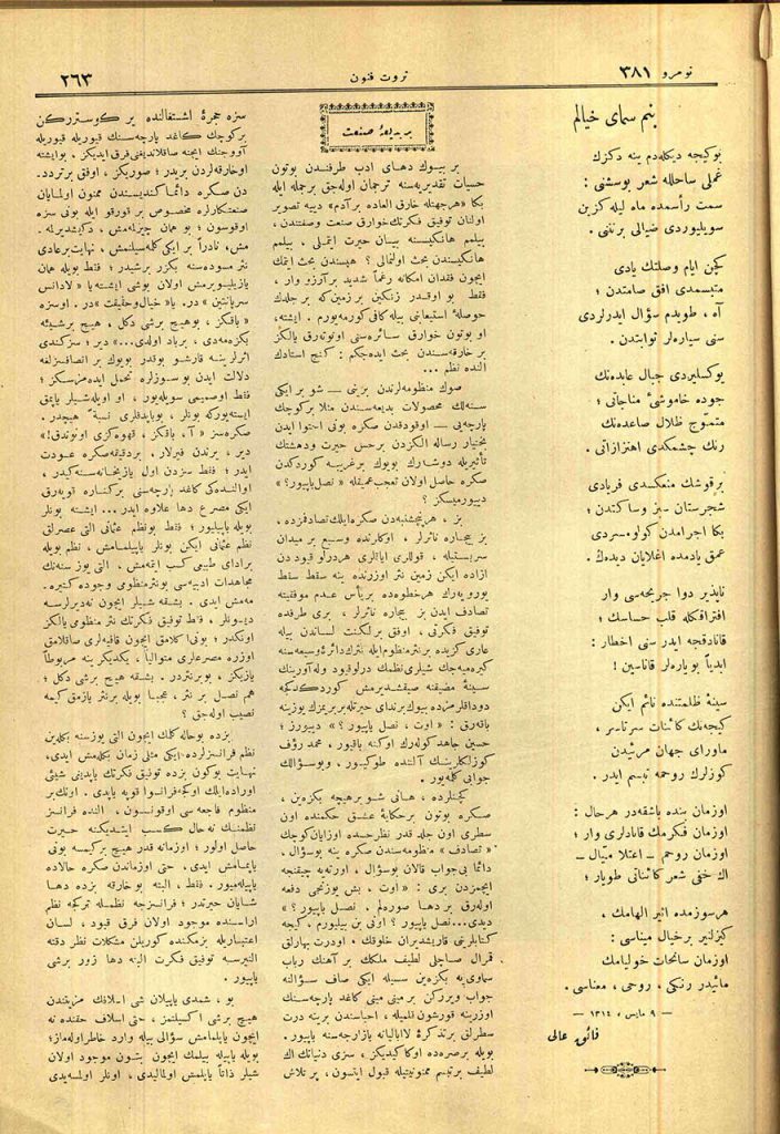 Bir büyük deha-yı edip tarafından bütün hissiyat-ı takdiriyesine tercüman olacak bir cümle ile bana “her cihetle harikulade bir adam” diye tasvir olunan Tevfik Fikret’in havarik-i sanat ve sıfatından, bilmem hangisine beyan-ı hayret etmeli, bilmem hangisinden bahis olunmalı? Hepsinden bahsetmek için fikdan-ı imkâna rağmen şedit bir arzu var, fakat bu o kadar zengin bir zemin ki bir cildin havsala-i istiyabını bile kâfi görmüyorum. İşte o bütün havarik-i sairesini unutarak yalnız bir harikasından bahsedeceğim: genç üstadın elinde nazım…