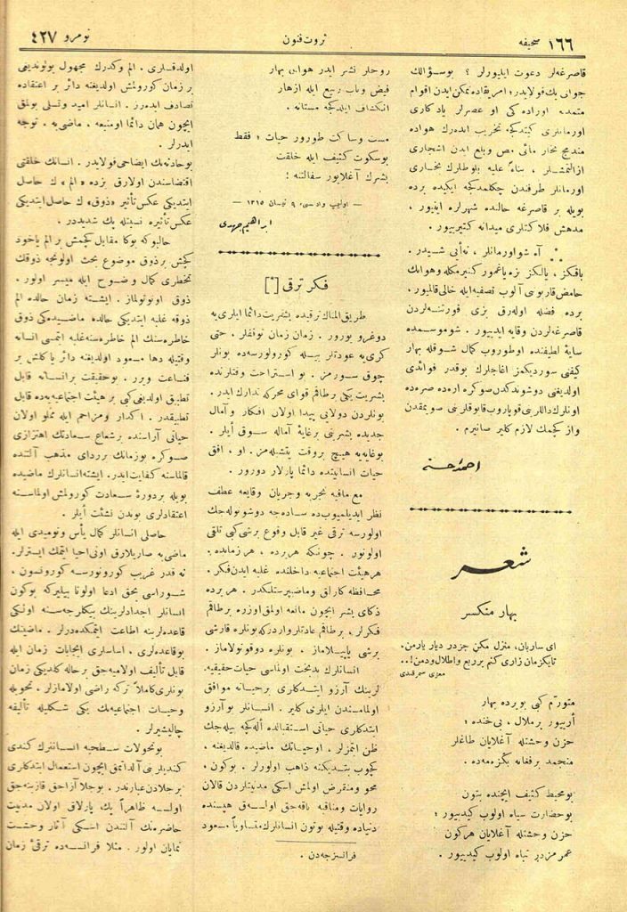 Mamafih tecrübe ve cereyan-ı vakayie atf-ı nazar edilmeyip de sadece düşünülecek olursa terakki gayr-ı kabil-i vuku bir şey gibi telakki olunur. Çünkü her yerde, her zamanda, her heyet-i içtimaiye dâhilinde galebe eden fikir, muhafazakârlık ve mazi-perestliktir. Her yerde zekâ-yı beşer için mânia olmak üzere birtakım fikirler, birtakım adetler vardır ki bunlara karşı bir şey yapılamaz, bunlara dokunulamaz.