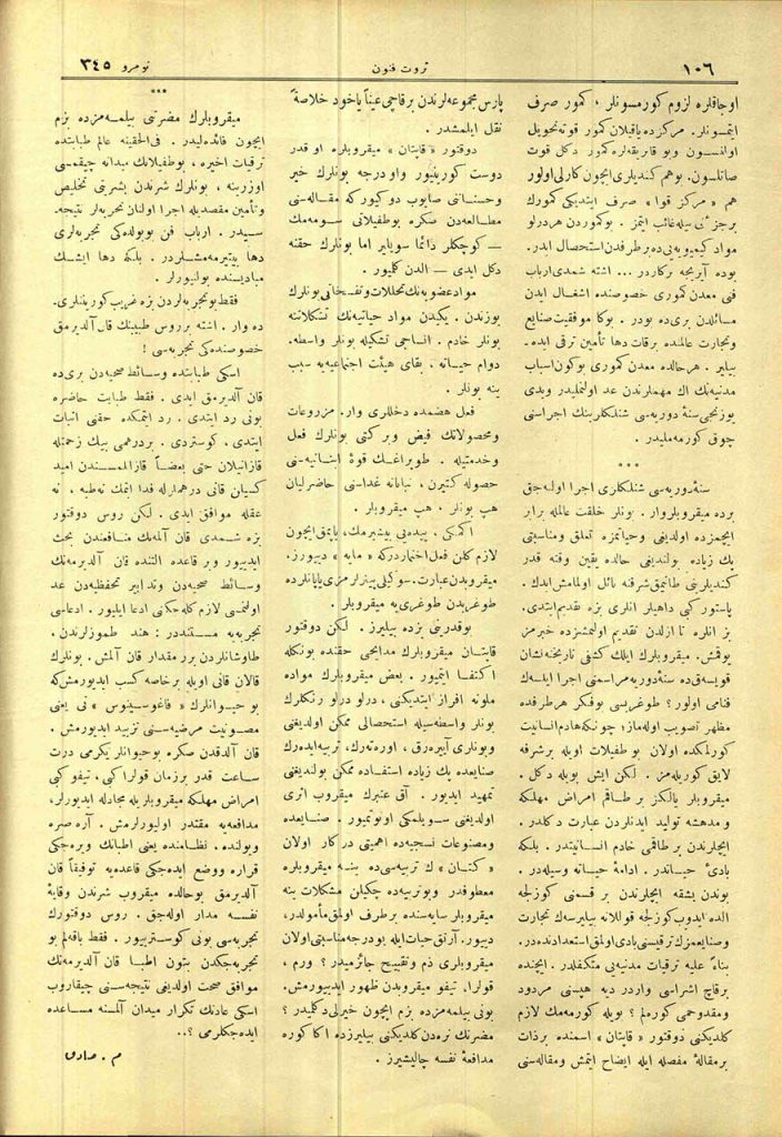 Maden kömürünün yedi yüzüncü sene-i devriyesi – Maden kömürünün keşfi ve Avrupa’da istimali – Sanayide ehemmiyeti – maden kömürünün ihracı ve nakli – Bu kömürün maden ocaklarında istimali hakkında bir fikr-i cedit – Mikropların faydalıları ve Mösyö Kapiton’un makalesi – Kan almak ve aldırmak – Makbul mü, merdut mu?