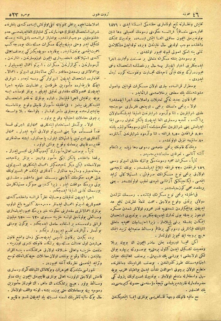 Fransa meclis-i mebusanının son devre-i içtimaını işgal eden en mühim mesele-i maliye müskirat rüsumunun tenkisine dair olan kanunun kabulüdür. Bu meselenin bir taraftan ahalinin hıfzıssıhhasına, belediyeler için bir madde-i hayatiye teşkil eden oktruva rüsumuna, diğer taraftan doğrudan doğruya hükûmet varidatı meyanında bulunan istihlakât vergilerine taalluk eylediği düşünülürse icraat-ı ahirenin, bazılarının zannettikleri gibi, na-be-hengâm değil belki geç vuku bulduğuna itimat etmek lazım gelir. Şu birkaç aylık iktisadi, içtimai, mali resail-i mevkute sayfalarında, ceraid-i yevmiye sütunlarında bu mesele fevkalade ehemmiyetle telakki edilmiş, bu bapta pek alimane, pek vakıfane mütalaalar serd olunmuştur. Böyle calib-i dikkat bir mesele-i maliye hakkında bizde de birkaç sayfa yazı yazmak pek beyhude olmaz sanırım. Bunları bilmeye, öğrenmeye bizim de ihtiyacımız olduğu inkâr edilemez değil mi?..
