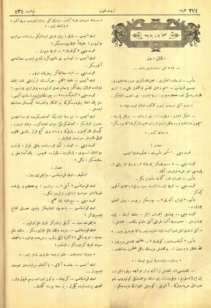 Sahaif-i Bedia: Finten’den Yazan: A. H. [Abdülhak Hâmid Tarhan] Kategoriler: Edebiyat Alt Kategoriler: Telif Kurmaca/Tiyatro Anahtar Kelimeler: Tefrika -389’uncu nüshadan beri mabad-