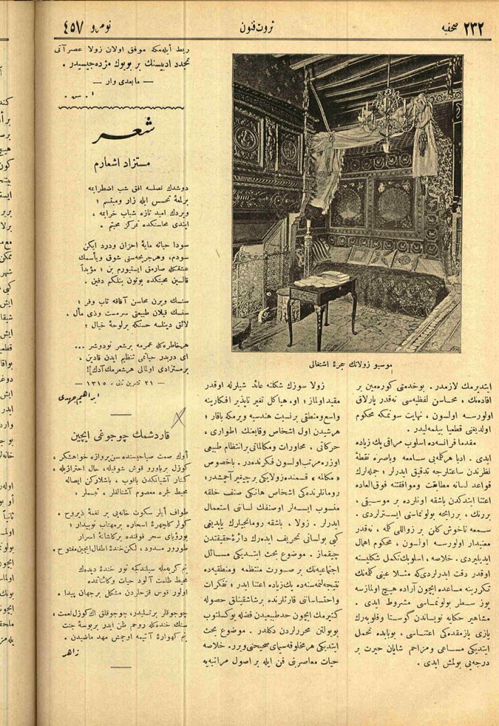 Şu vesileyle Mösyö Zola’nın çocukluğundan itibaren muhtelif zamanlardaki sima-yı hayatını gösterir birkaç tasvir ile beraber hücre-i iştigalinin, salonunun da birer fotografisini derç ediyoruz.